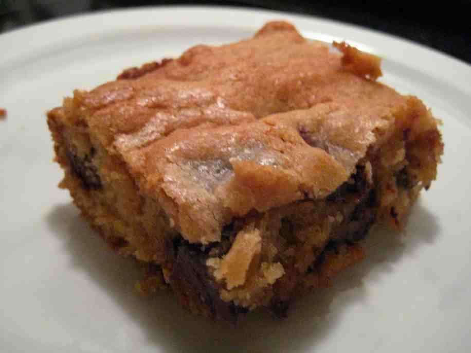 Oh Congo Bars… or maybe you can call them “Blondies” or “Cookie Bars”. But whatever the name, they are tasty! and if you are still shaking your head and thinking what is she talking about? I am talking about a bar dessert similar to brownies, but without the cocoa, like a chocolate chip cookie but not. My aunt used to make these for us when I was a kid, and I saw them again a week ago on Bakerella’s website and I just had to make them. My husband loved them, my co-workers loved them and a friend of mine was very excited to receive an unexpected treat. Needless to say, this is one recipe to hold onto and make again and again.