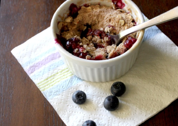 Blueberry + Kiwi, really? Yes, trust me. Really? OK so maybe your thinking kiwi is just something you put on fruit pizza. I’ll admit it is one of those fruits I have commonly overlooked. However, my new found love of kiwi is actually a credit to my daughter. Since they are full of vitamin C and soft = easy to eat, I buy them quite frequently for her. It’s no surprise that I have eaten a few bites of my own recently while slicing her up some. The other day at the store while grabbing a couple of kiwi, I also picked up a container of fresh blueberries. But it wasn’t until Sunday that the idea of combining the two into something sweet actually occurred to me. At first I was thinking of making muffins or some sort of tart, but I really wanted to make a dish that the fruit was the star of. A blueberry kiwi crisp just seemed like the best way to enjoy these two delicious fruits together, so I whipped this little one serving treat up for myself. It was tart, sweet, fresh and light all at the same time, the recipe below is for a single serving, but you may need to double, triple or even quadruple it to have some leftovers. Whether warm out of the oven, with a dollop of whip cream or scoop of vanilla ice cream; this fresh summer treat is one that I am sure you’ll enjoy for months to come, happy baking!