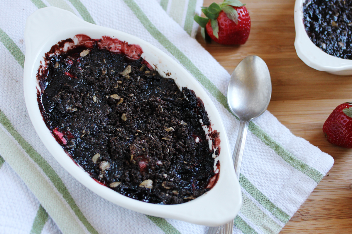 The title of this recipe may leave you wondering, what? or maybe you’re intrigued or perhaps even thinking about chocolate covered strawberries? Man do I love me some chocolate covered strawberries! But what girl doesn’t right? There is a candy company in Jacksonville, FL called Peterbrooke Chocolatier and they make some truly amazing confections, one of which is chocolate covered strawberries. Yesterday I had a brownie craving at 8 in the morning, you know those days when the urge hits way too early? Well this got me thinking about how to satisfy said urge and after a trip to the gym and the grocery store I turned to my trust brownie cook book. If you haven’t read one of the posts I have done about brownies since last October, than you need to check out Brownie Points by Lisa Slater. I was thumbing through the book and a recipe for crumble topping caught my eye; at this point I started questioning what I was reading and trying to decide if strawberries baked with brownie crumble would taste good or not? Obviously my instincts told my mind to stop being crazy and start mixing. Fresh strawberries tossed in lemon juice and sugar and covered with a deliciously, rich chocolate topping makes for a decadent dessert any brownie lover must try. You can substitute the fruit for another of your choice, especially depending on the season; I can’t wait to try this with cherries. Whether you serve it alone or with ice cream, I hope you’ll enjoy; happy baking!