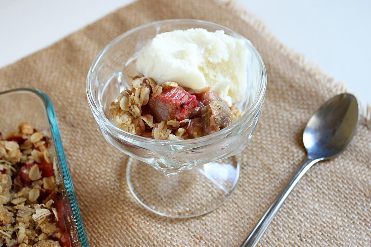 Like many of you, I love to spending time with my family and I especially love sharing family recipes. For me there is just something so special about passing on a recipe my loved ones treasure, but most importantly the feeling that I have for said recipe. One of my absolute favorite recipes from my childhood is Rhubarb Crunch, a little odd I know. I have always loved the sweet and tangy flavors of this crisp, we usually ate it warm with a scoop of vanilla ice cream, but I have been known to eat it plain at breakfast. This crisp is one of the recipes that I can remember my mother making on Sunday evenings or for special occasions and she passed it on to me when I left for college. Incidentally we have both misplaced the original recipe and so this is my recreation of the family classic. Next time you are in the mood for a dessert a little out of the ordinary, check the freezer section of your local grocery store for some rhubarb (or if you’re lucky enough for it to be in season the produce department). I hope you’ll enjoy, happy baking!