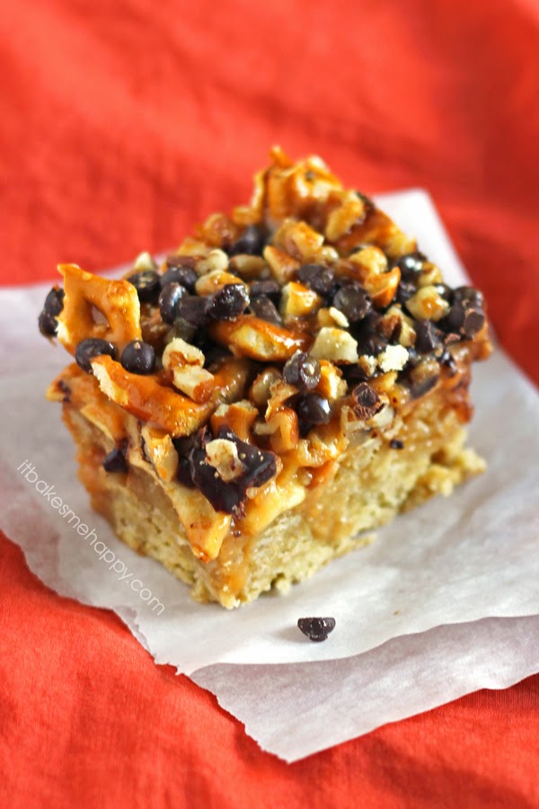 - Sprinkle on the pecans, pretzels and chocolate chips.