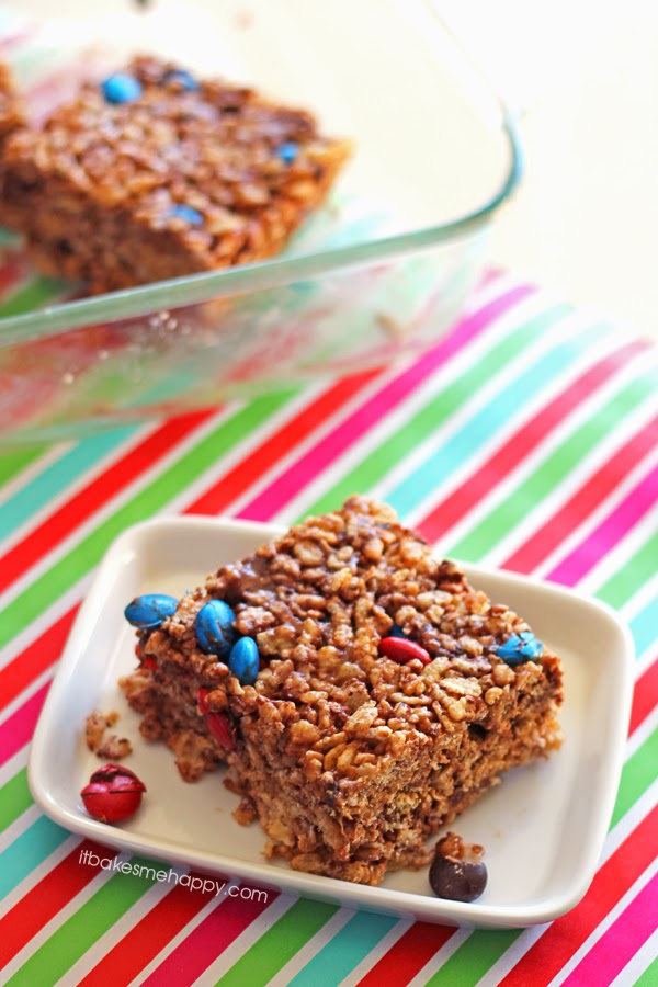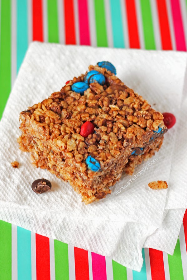 Prepare a 9″ x 13″ baking pan with cooking spray and set aside. In a microwave safe bowl melt the butter, peanut butter and marshmallows for 1-2 minutes, stirring every 30 seconds, until smooth. Add the cereal, chocolate chips and M&M’s, stir to combine; press the mixture firmly into the pan and let cool. Slice and serve.