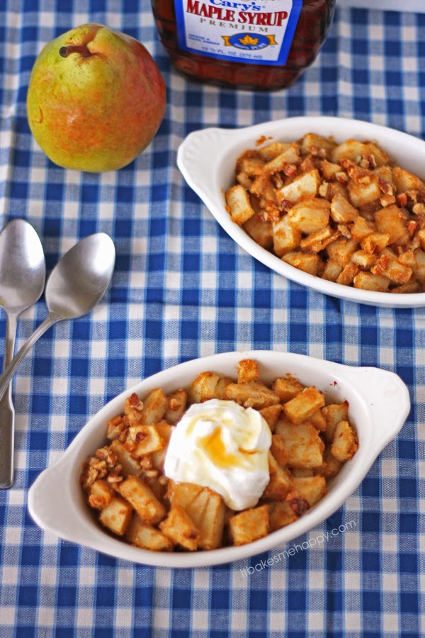 These baked pears have all the delicious flavors of a pie with out the guilt of the crust and bake in half the time! Juicy pears tossed with maple syrup and crunchy pecan bits, this dessert is delicious and low fat. Serve it with a dollop of Greek yogurt and a drizzle of maple syrup or a scoop of vanilla ice cream. Enjoy and happy baking!