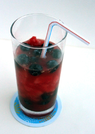 In your blender add the watermelon, ice, lemon juice, sugar and puree until almost smooth. I think a little chunky texture is nice, but do what you like best. Serve immediately, I alternated mine with layers of frozen blueberries.